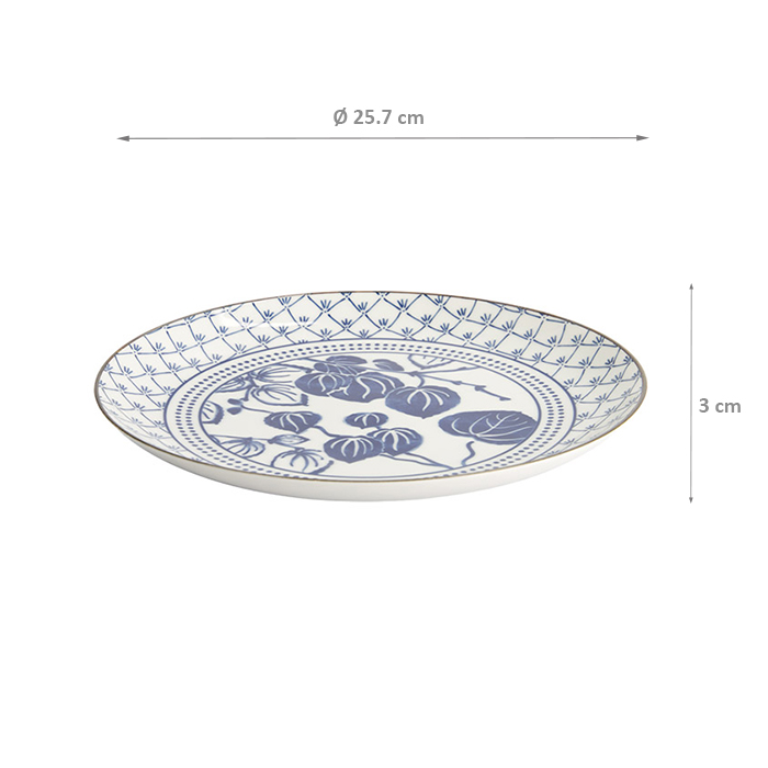 Der TDS Teller Flora Japonica Ivy (25,7 × 3 cm) besticht durch ein feines Flora Japonica Ivy-Muster in zeitlosem Blau-Weiß, das traditionelle japanische Ästhetik mit vielseitiger Funktionalität verbindet. Das stilvolle Design bereichert sowohl den Alltagstisch als auch moderne Tischarrangements.