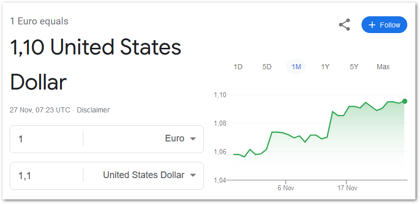 You can see how much your order will cost in converted terms at any time on Google, for example, by converting the current euro prices into other currencies: