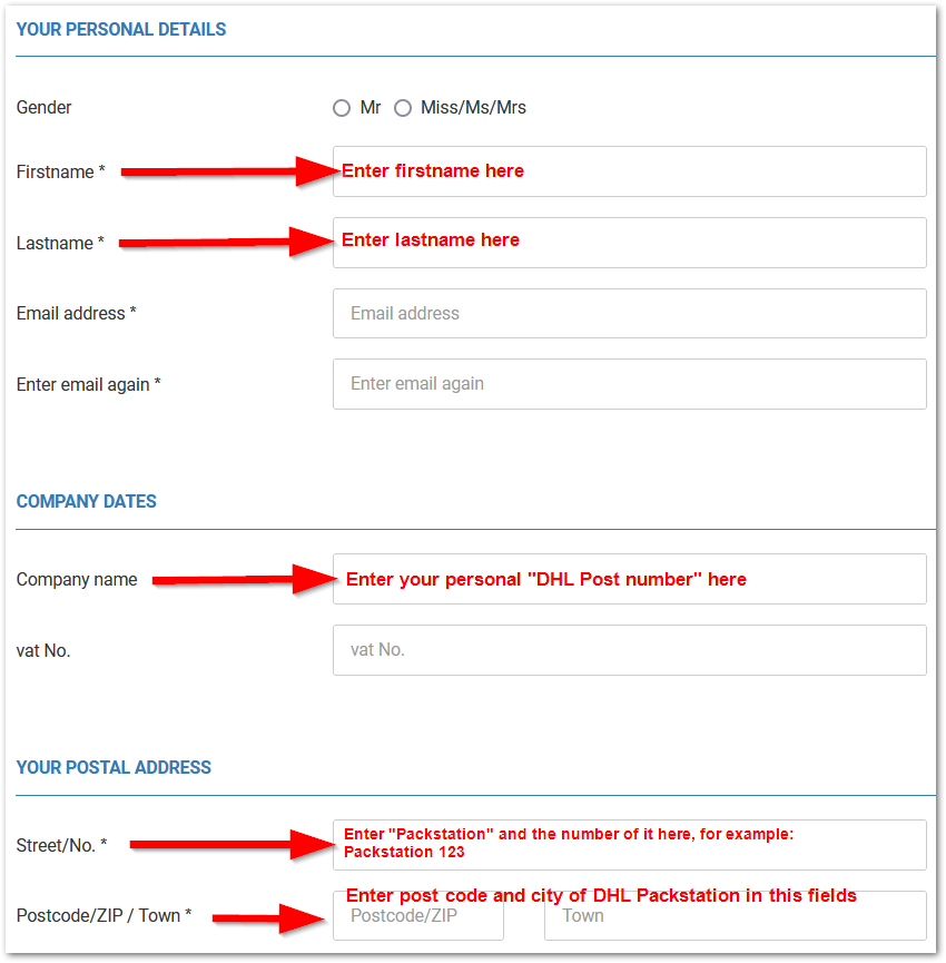 Of course, you can also have your shipment sent to a DHL Packstation for deliveries within Germany. To do this, simply enter your DHL post number and the details of your desired Packstation as the shipping address in the following fields during the ordering process: