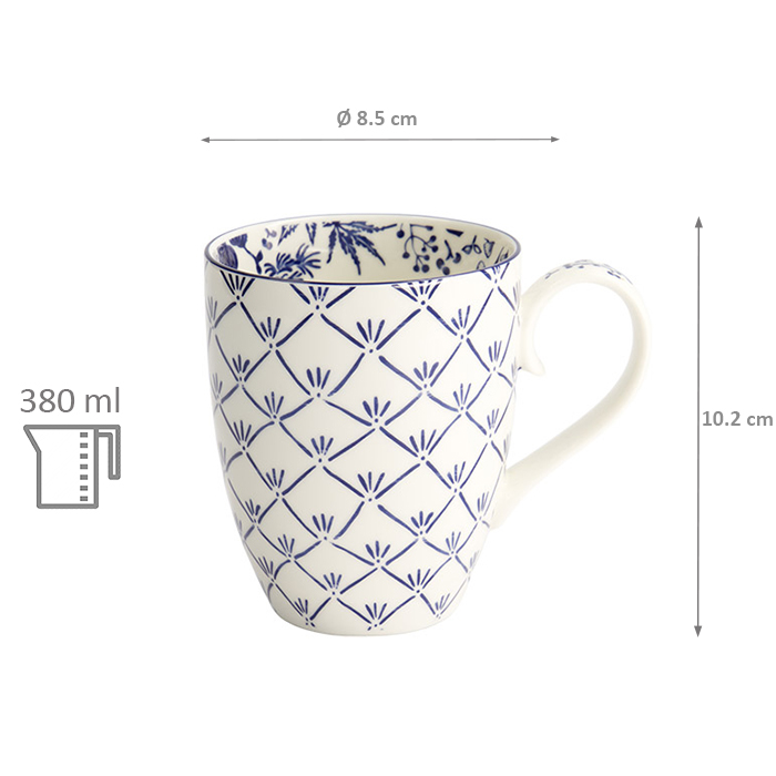The TDS Mug Flora Japonica Maple (8.5 × 10.2 cm, 380 ml) features a refined Flora Japonica Maple pattern in classic blue and white, blending traditional Japanese aesthetics with everyday versatility. Its elegant design enhances both casual drinks and stylish table settings.