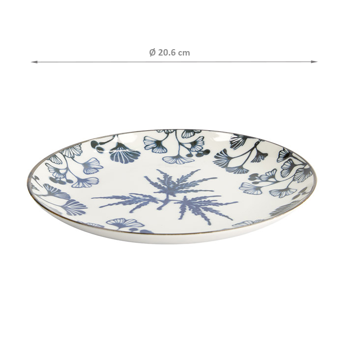 The TDS Plate Flora Japonica Maple (20.6 × 2.2 cm) features a delicate Flora Japonica Maple pattern in classic blue and white, blending traditional Japanese aesthetics with everyday versatility. Its elegant design enhances both casual dining and contemporary table settings.